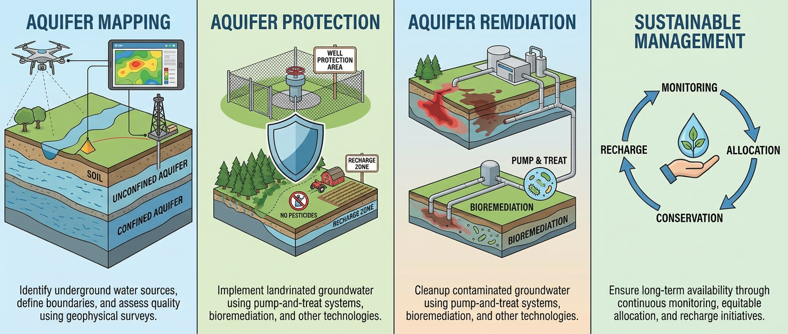 Aquifer protection focuses on preventive and regulatory-aligned planning, including: